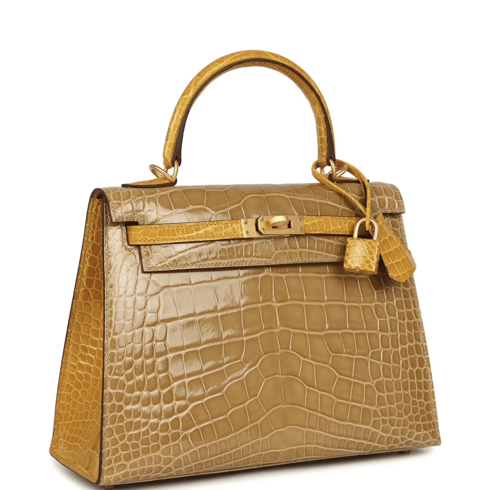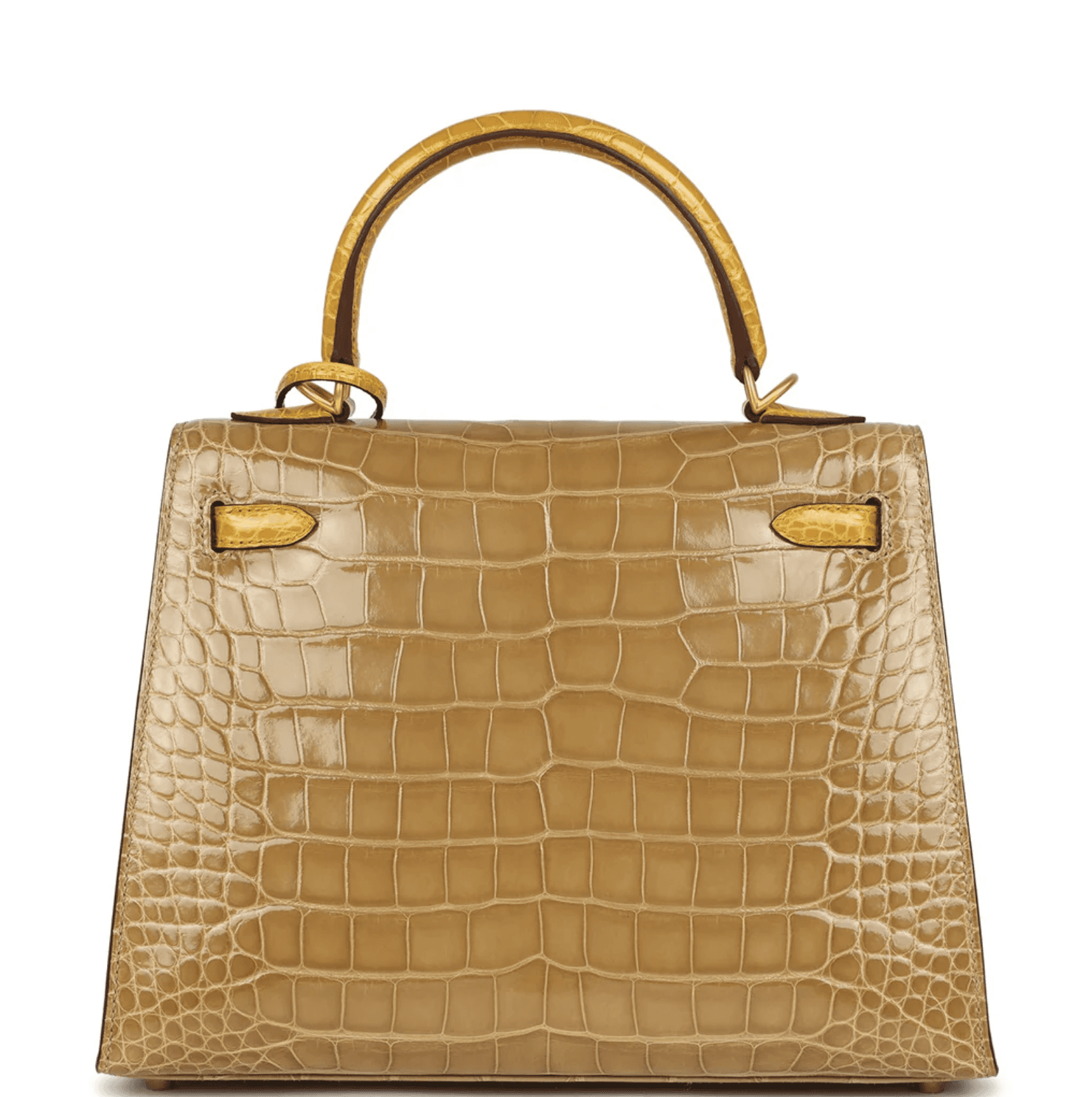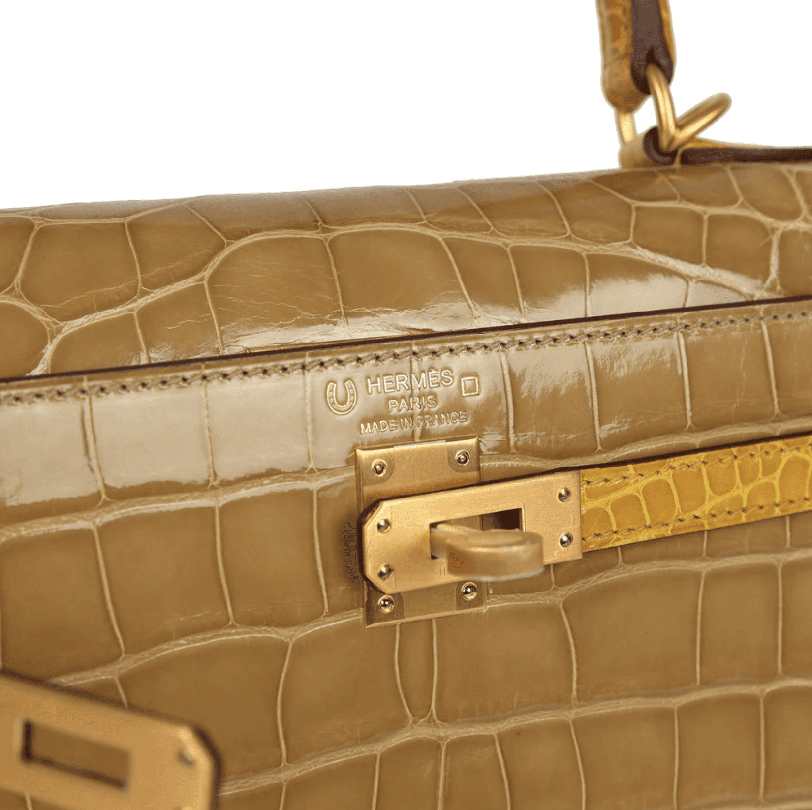 This Special Order Kelly, is in Beige and Ambre Shiny Alligator leather with brushed gold hardware and has tonal stitching, two straps with front toggle closure, clochette with lock and two keys, single rolled handle and removable shoulder strap. The interior is lined with Beige Sable chevre and has a zipper pocket with an Hermès engraved pull and one pocket on the opposite side. Collection: U (2022) Origin: France Condition: Never worn (plastic on hardware). Accompanied by: Hermès box, Hermès dustbag, felt, clochette, clochette dustbag, shoulder strap, shoulder strap dustbag, lock, two keys