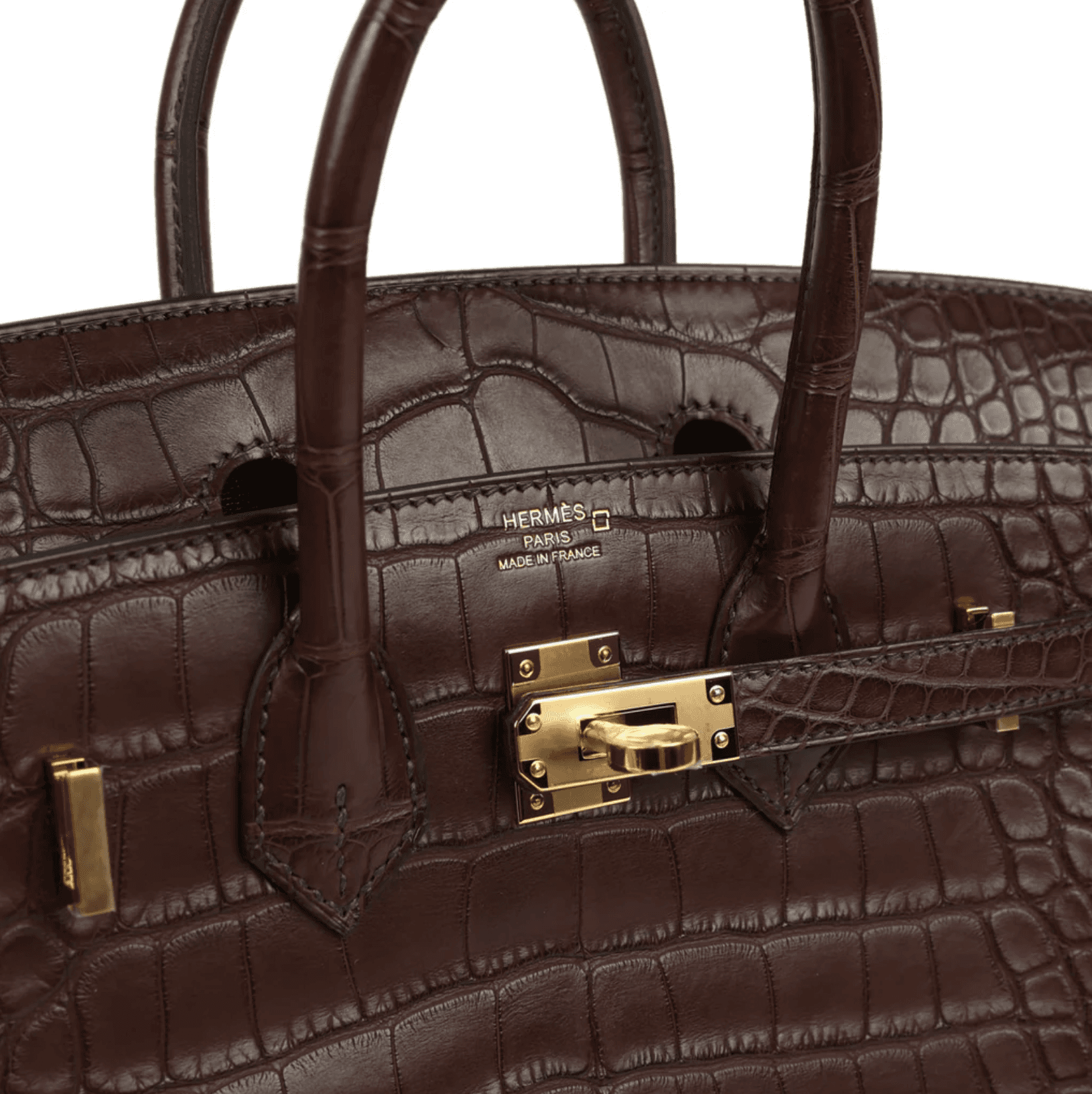 This Birkin is in Chocolate Niloticus Matte Alligator leather with gold hardware and has tonal stitching, front flap, two straps with center toggle closure, clochette with lock and two keys, and double rolled handles. The interior is lined with Havane chevre leather and has one zip pocket with an Hermès engraved zipper pull and an open pocket on the opposite side. Collection: W (2012) Origin: France Condition: New and never worn (plastic on hardware) Accompanied by: Hermès box, Hermès dustbag, felt, clochette, lock, two keys, clochette dustbag, carebook