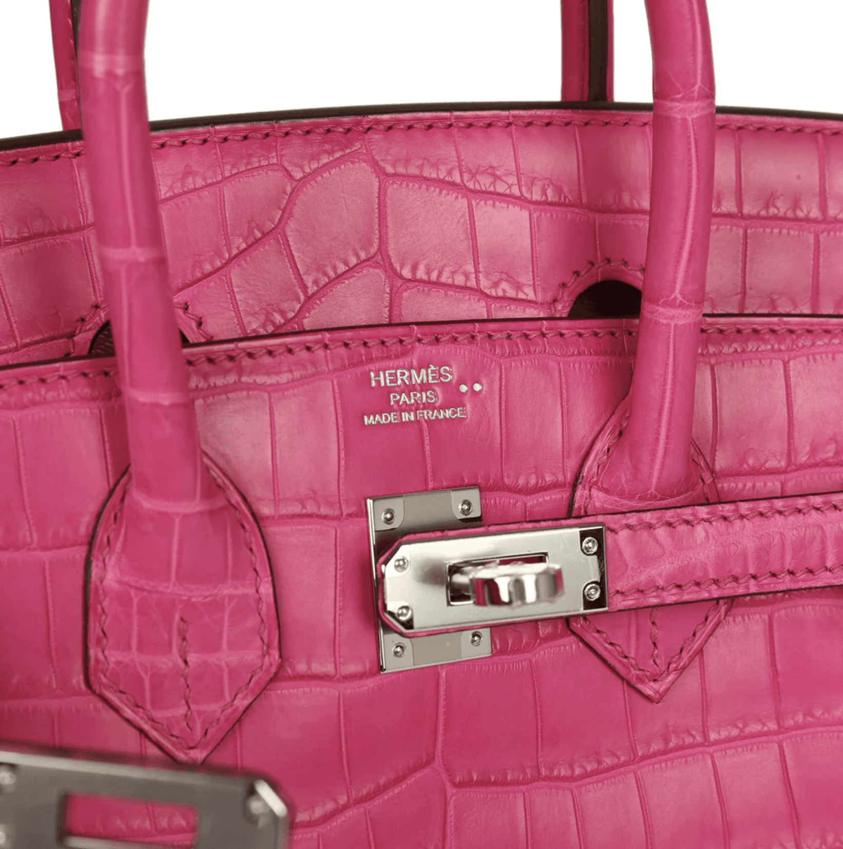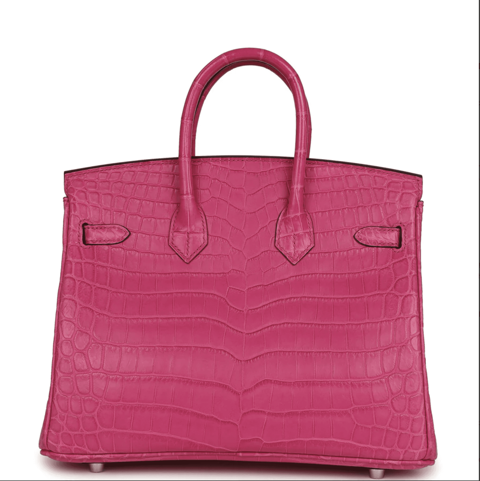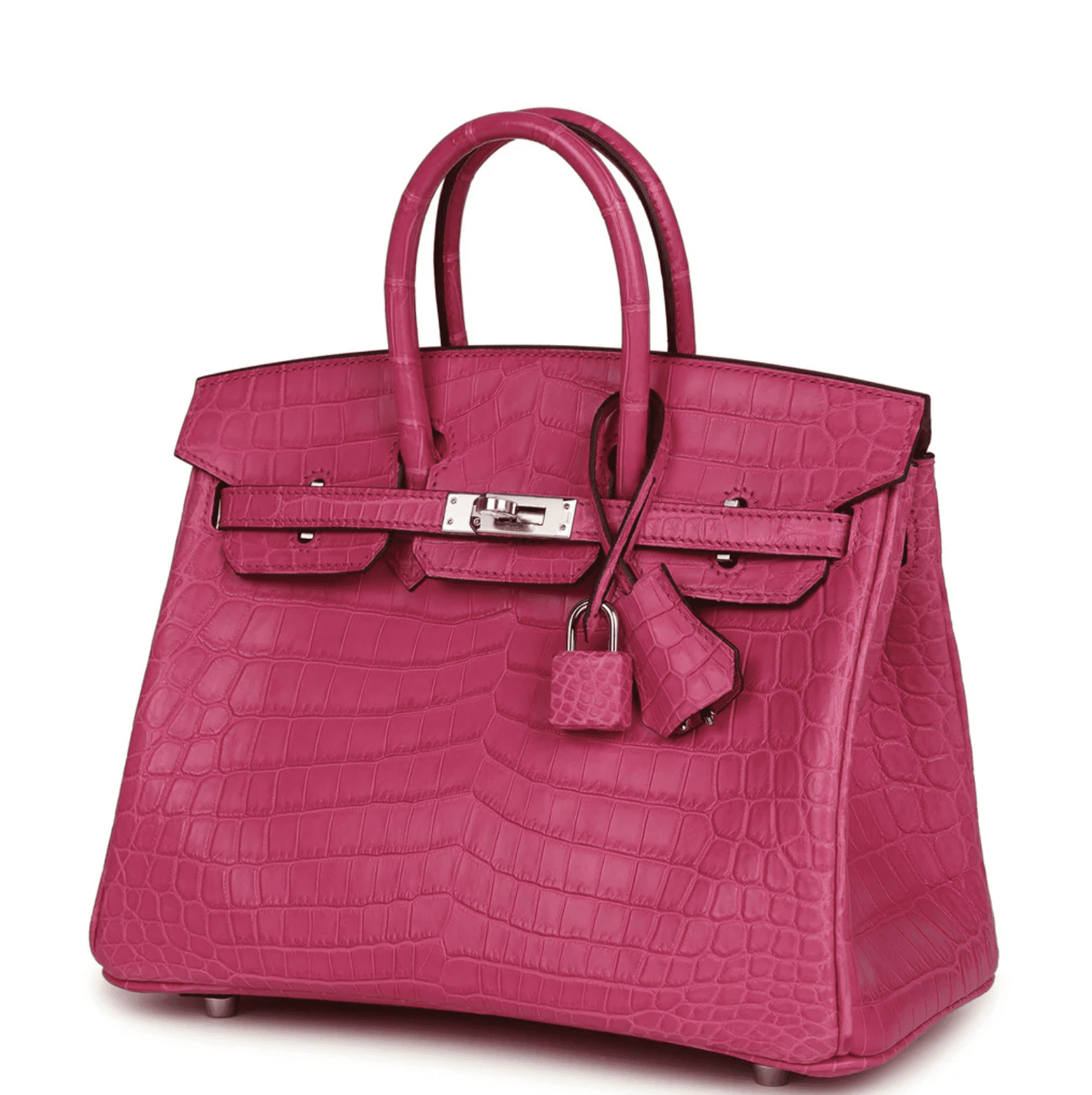 This Birkin 25 is in Rose Matte Crocodile leather with palladium hardware and has tonal stitching, front flap, two straps with center toggle closure, clochette with lock and two keys, and double rolled handles. The interior is lined with Rose Shocking chevre leather and has one zip pocket with an Hermès engraved zipper pull and an open pocket on the opposite side. Collection: Z (2021) Origin: France Condition: New and never worn (plastic on hardware) Accompanied by: Hermès box, Hermès dustbag, felt, clochette, lock, two keys, clochette dustbag, carebook, rainhat